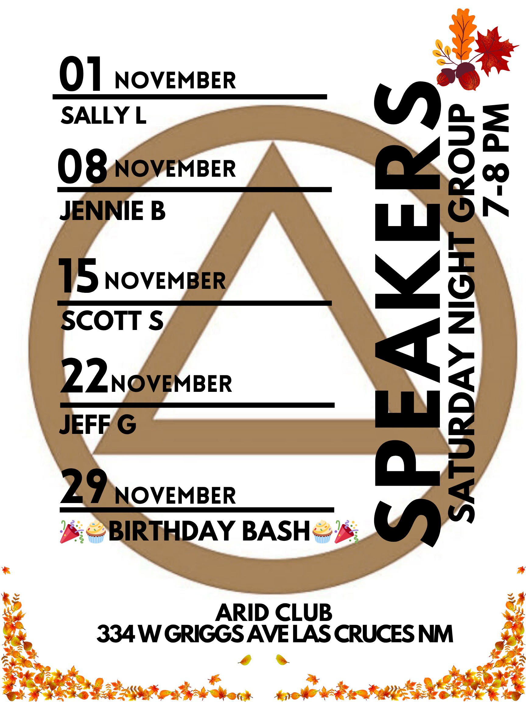 The Area 46 Delegate Report has been rescheduled before the district business meeting at 8:30 am Sunday November 23rd at Our Lady of Guadalupe in Tortugas (3600 Parroquia St., Las Cruces)